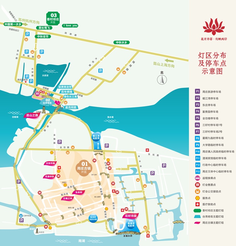 2.星期九、大学路和周庄文体中心临时停车场至周庄景区换成点(爱淀路)开通免费接送服务,接送时间:9:00-22:30。